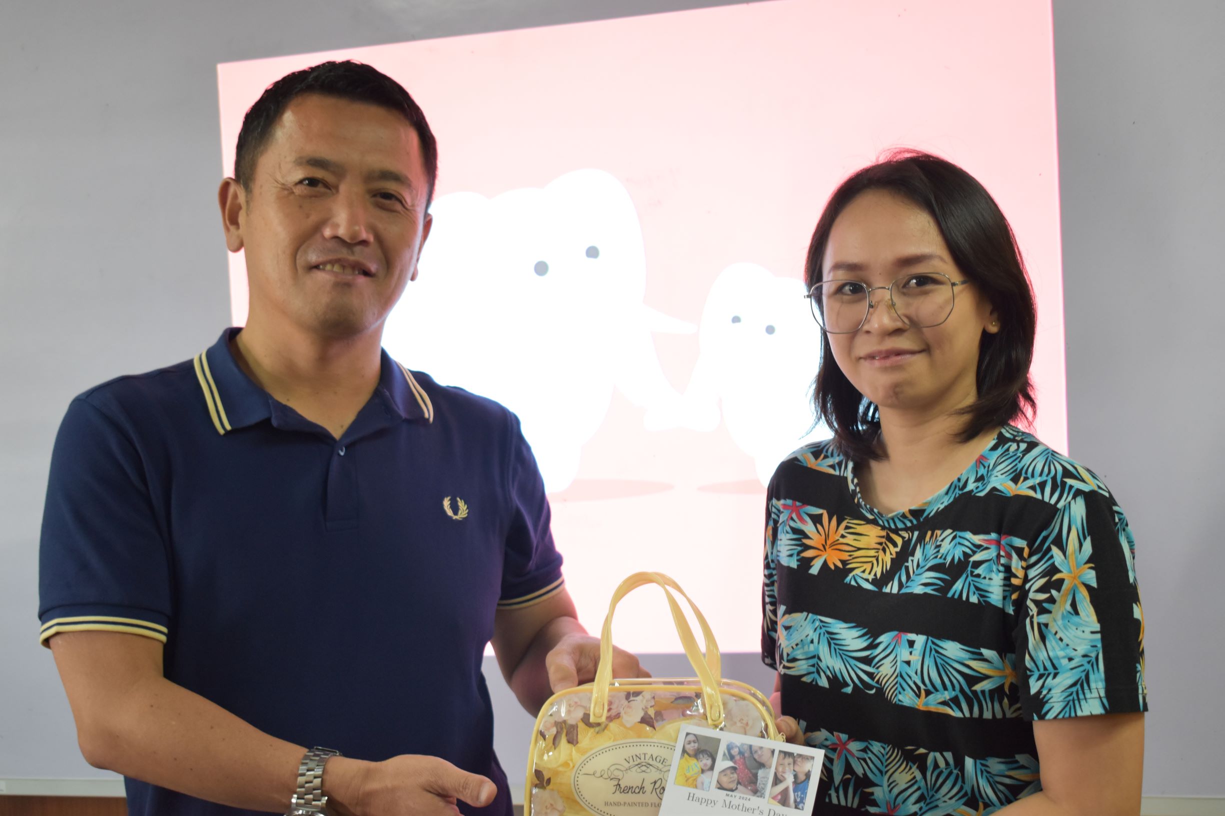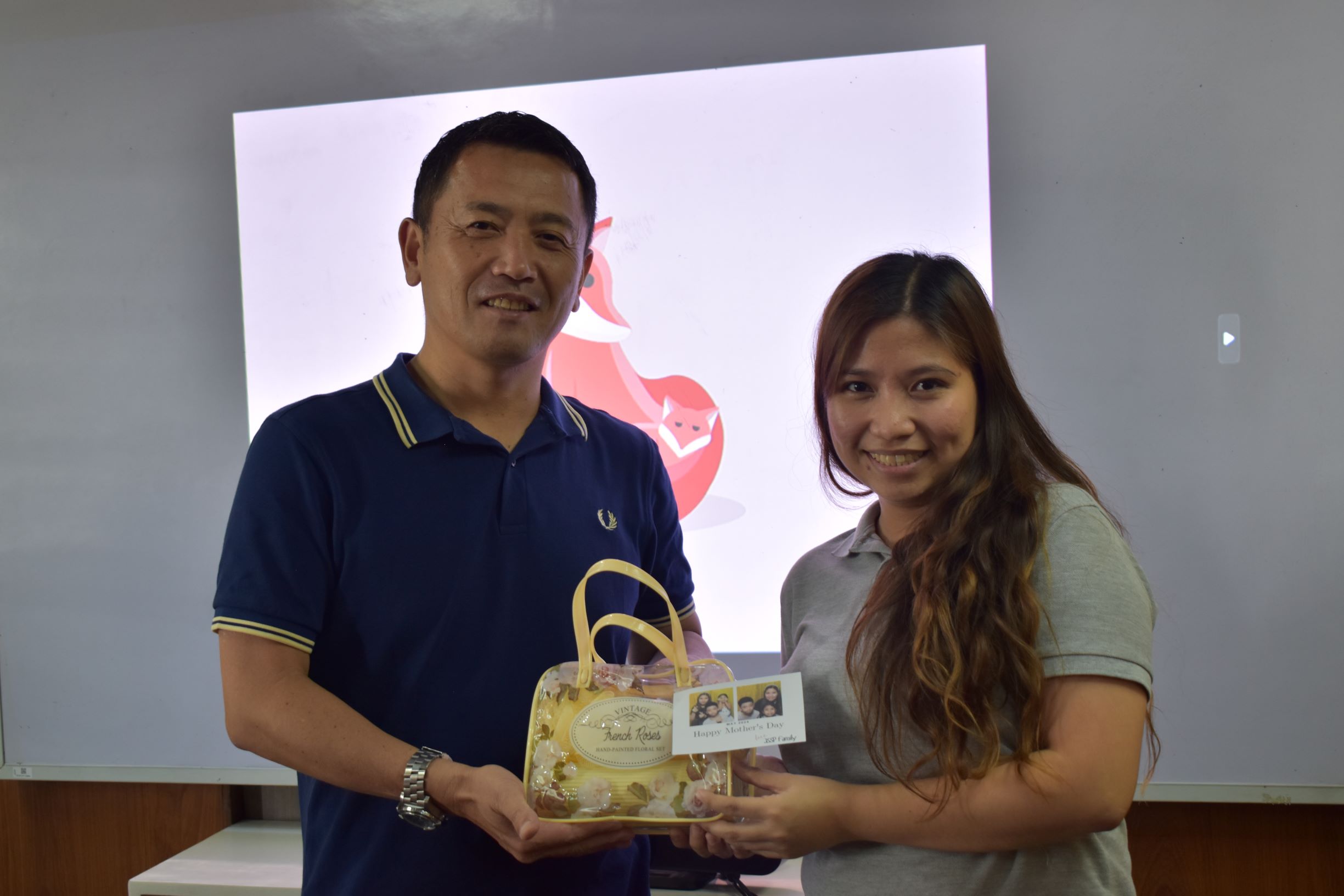 当日は社員一同から「Happy Mother’s Day for JSSP Family」のメッセージが記されたケーキがプレゼントされ、皆で分け合いながら、「母親たちの子どもへの愛情の深さ」についてのビデオを観賞しました。岡本社長からは、日頃の感謝の気持ちを込めて、メッセージカードとともに、髪くしやスポンジ、歯ブラシホルダーなどが入った日用品セットが記念品として贈られました。参加した女性社員からは、「食事もケーキもとても美味しく、記念品は日常生活で役立つものばかりでうれしかったです」などの声が寄せられました。