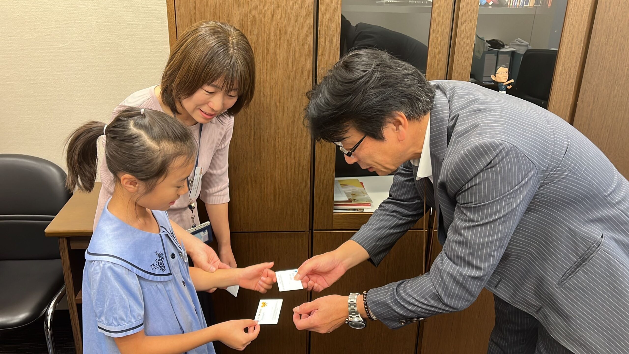 第2部は小林社長の挨拶でスタートし、工作タイムで制作したフォトプロップスを手に記念撮影を行いました。その後、毎年恒例となった役員室訪問にて、名刺交換を体験し、オフィス見学では、子供たちがオフィスの各所に配置されたシールを集めながら、社員と交流を深めました。最後は、人事部が用意した手作りの的入れゲームにチャレンジし、賞品としてお菓子の詰め合わせが贈られました。さらに、参加者には当グループ会社である川商フーズのギフト券が配られました。