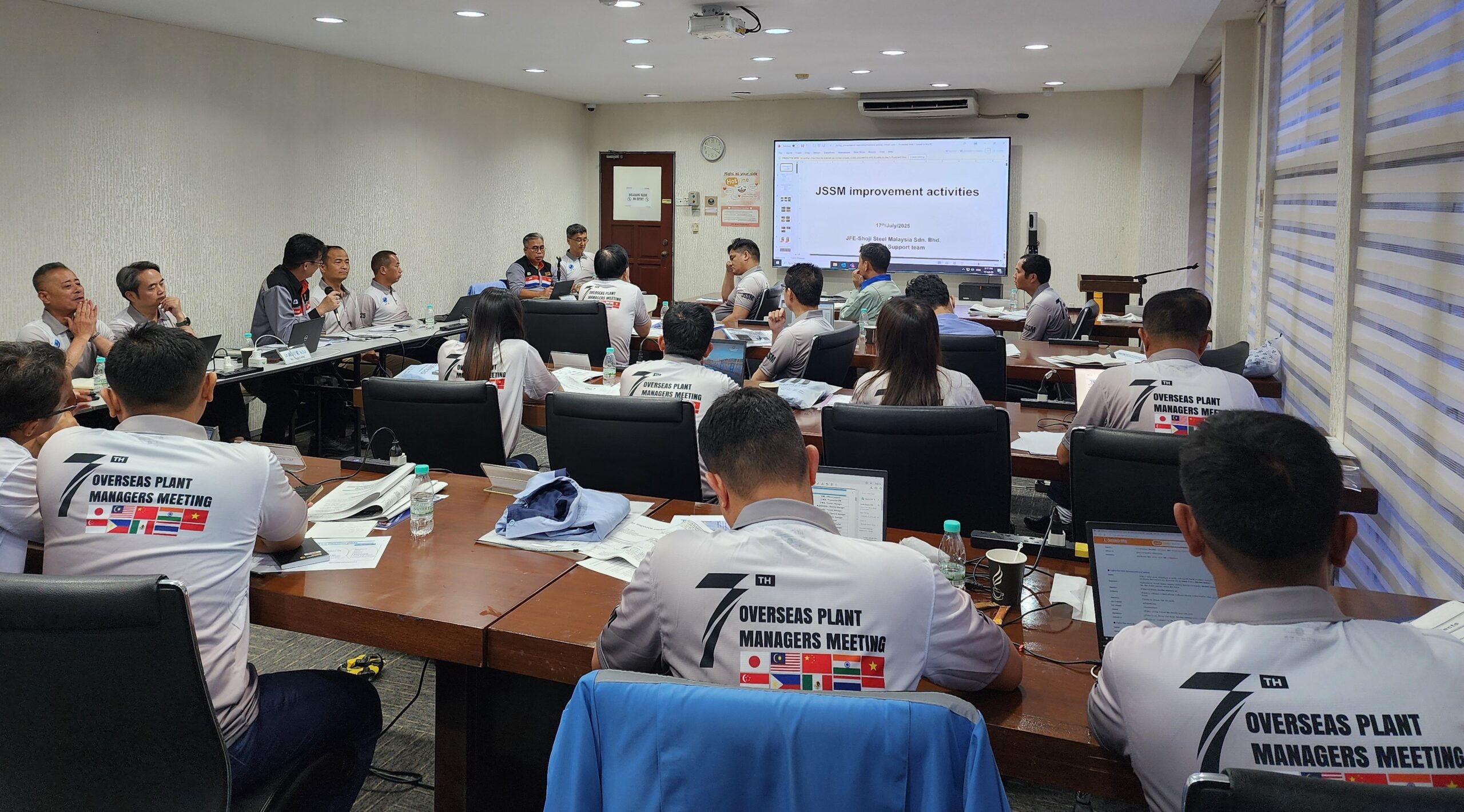 7月17日、技術総括部はグループ会社のJFE Shoji Steel Malaysia Sdn. Bhd.(以下、JSSM)にて「第7回 海外工場長会議」を開催しました。海外のグループ会社13社から計30人が参加したこの会議は、同部が策定した「工場運営標準」に基づき、2017年より年に1回、海外グループ会社の工場にて開催しており、各社の改善事例の情報共有および水平展開を目的に実施しています。