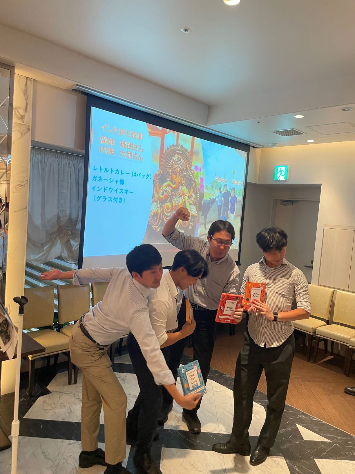 チーム対抗では協賛品や川商フーズの人気商品「ノザキのコンビーフ」が贈られ、歓声が上がりました。結果発表では、金属第一室が見事に優勝し、喜びに沸きました。一方、最下位となった鉱石室は、来年度の幹事を務めることが決まり、悔しさを滲ませる場面も見られました。