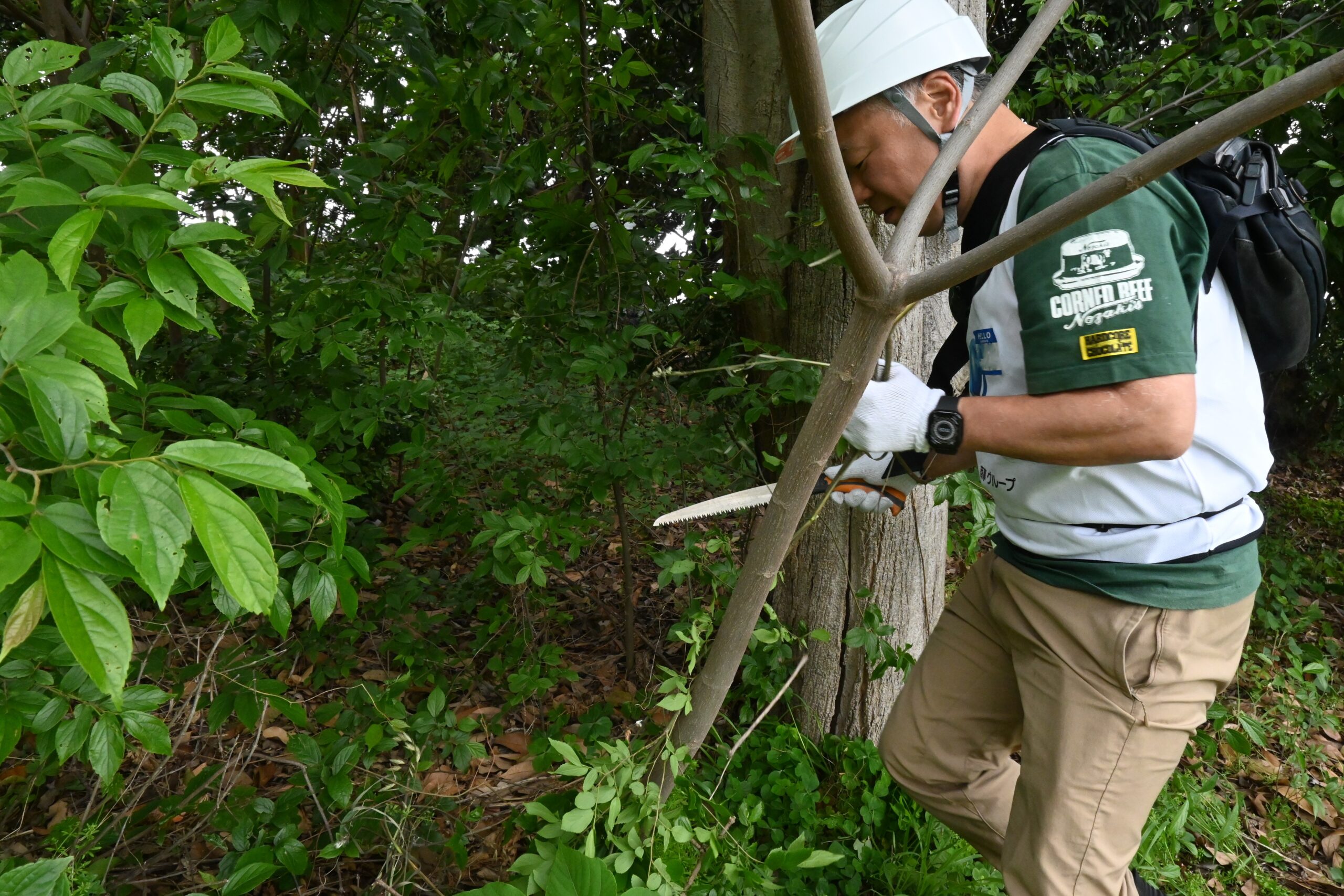 本プログラムはNPO法人「森のライフスタイル研究所」のサポートのもと行われ、スケートボードパーク入口付近の樹木帯を中心に、伸びすぎた枝や密集した細木の剪定作業を行いました。