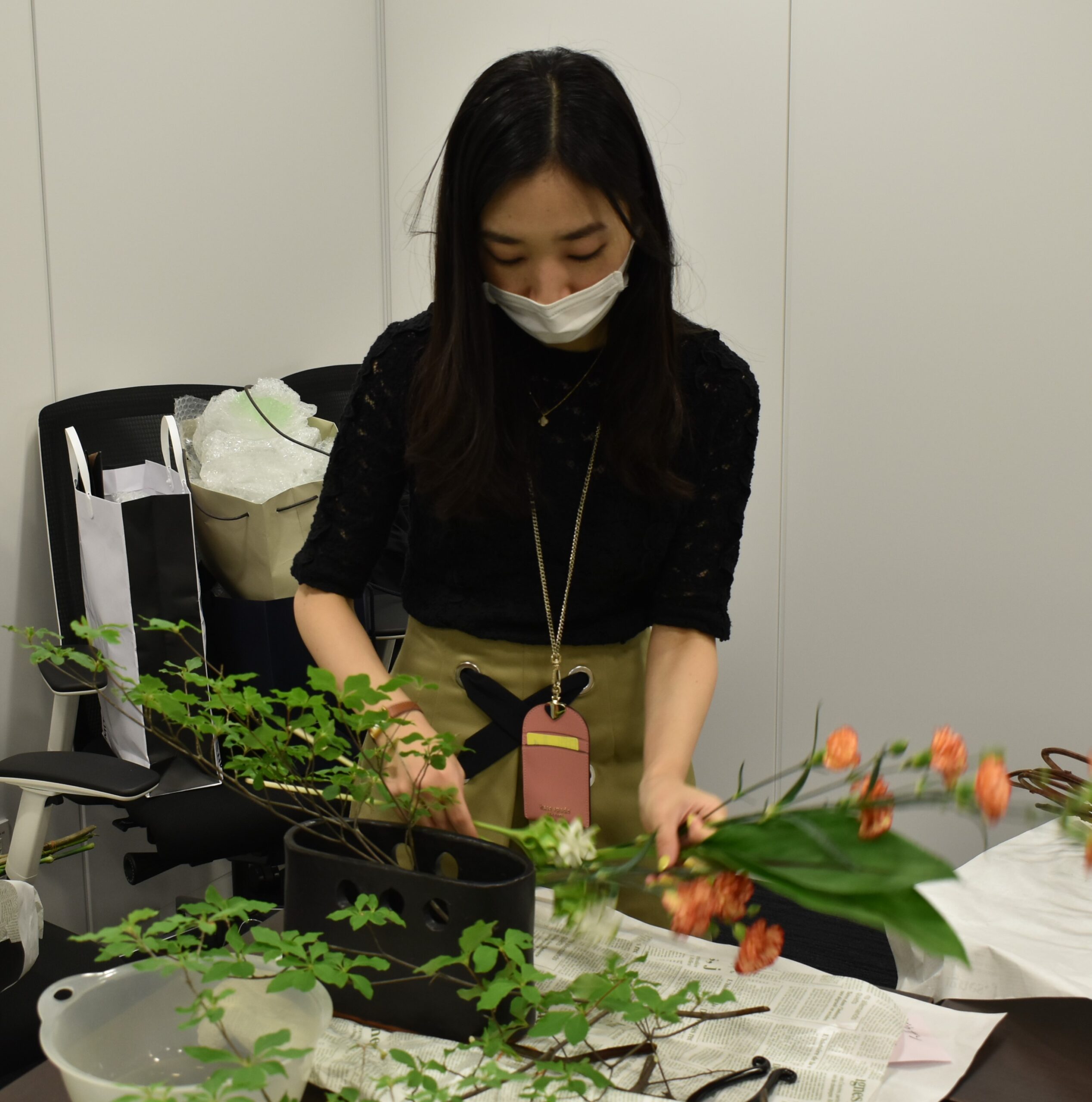 初めての生け花。ドキドキしながら作品制作を行いました