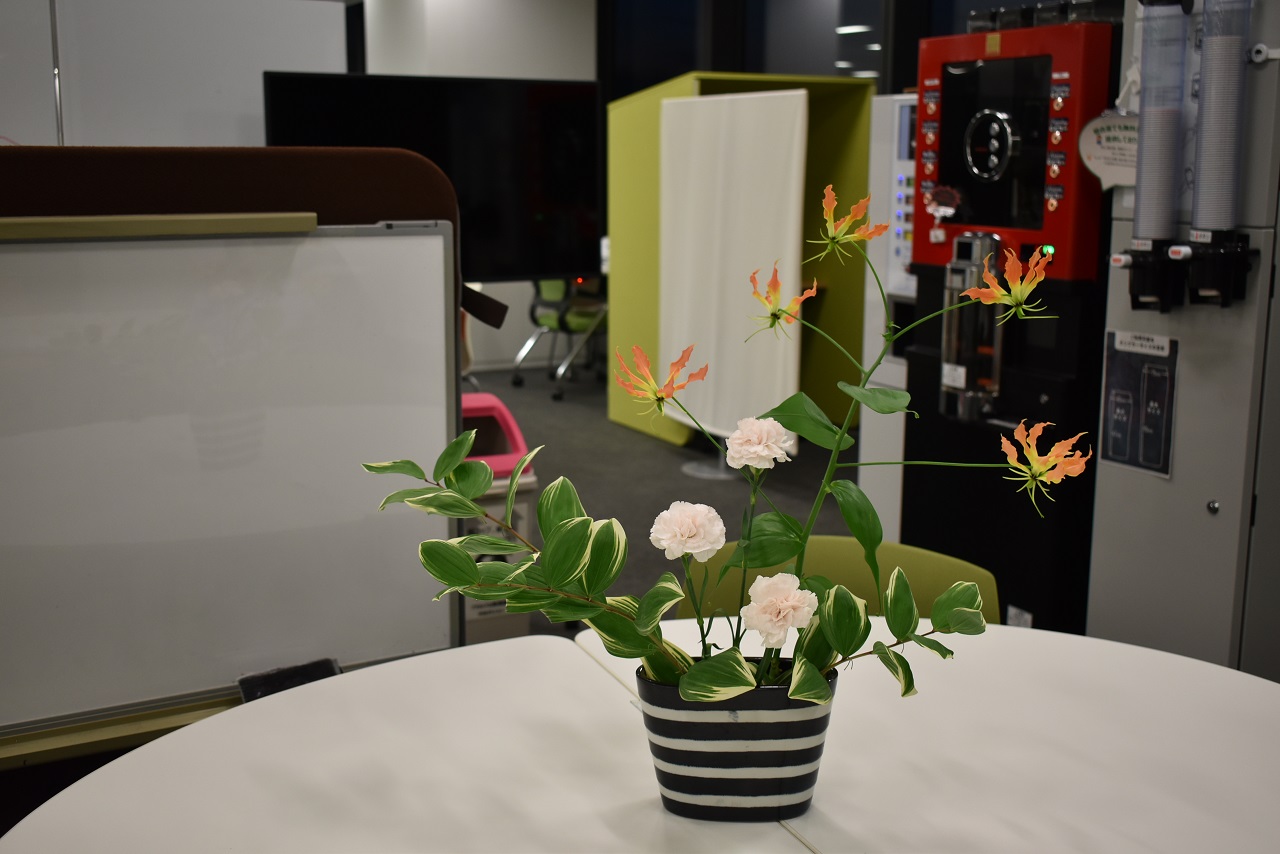 当社クラブ活動において、華道部が7月20日に本社にて『小さな華道展』を開催しました。コロナ禍の影響で、月1回のお稽古しか活動できない日々が続く中、華道の魅力を発信したいという思いから企画・実施しました。