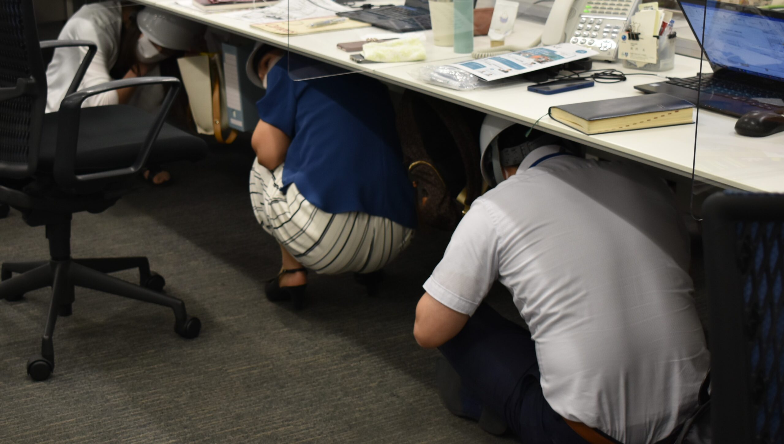 ヘルメットを被って机の下に避難しました