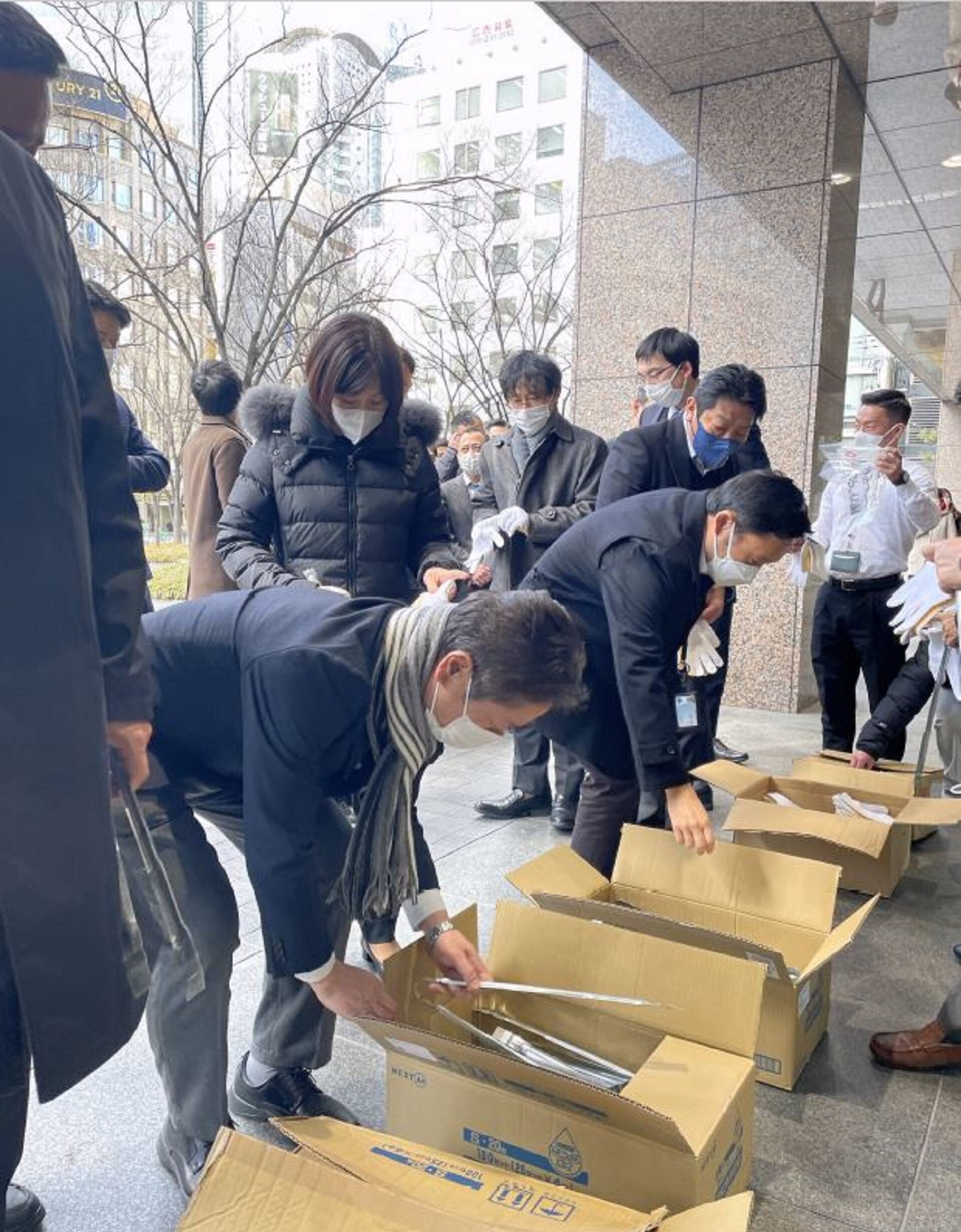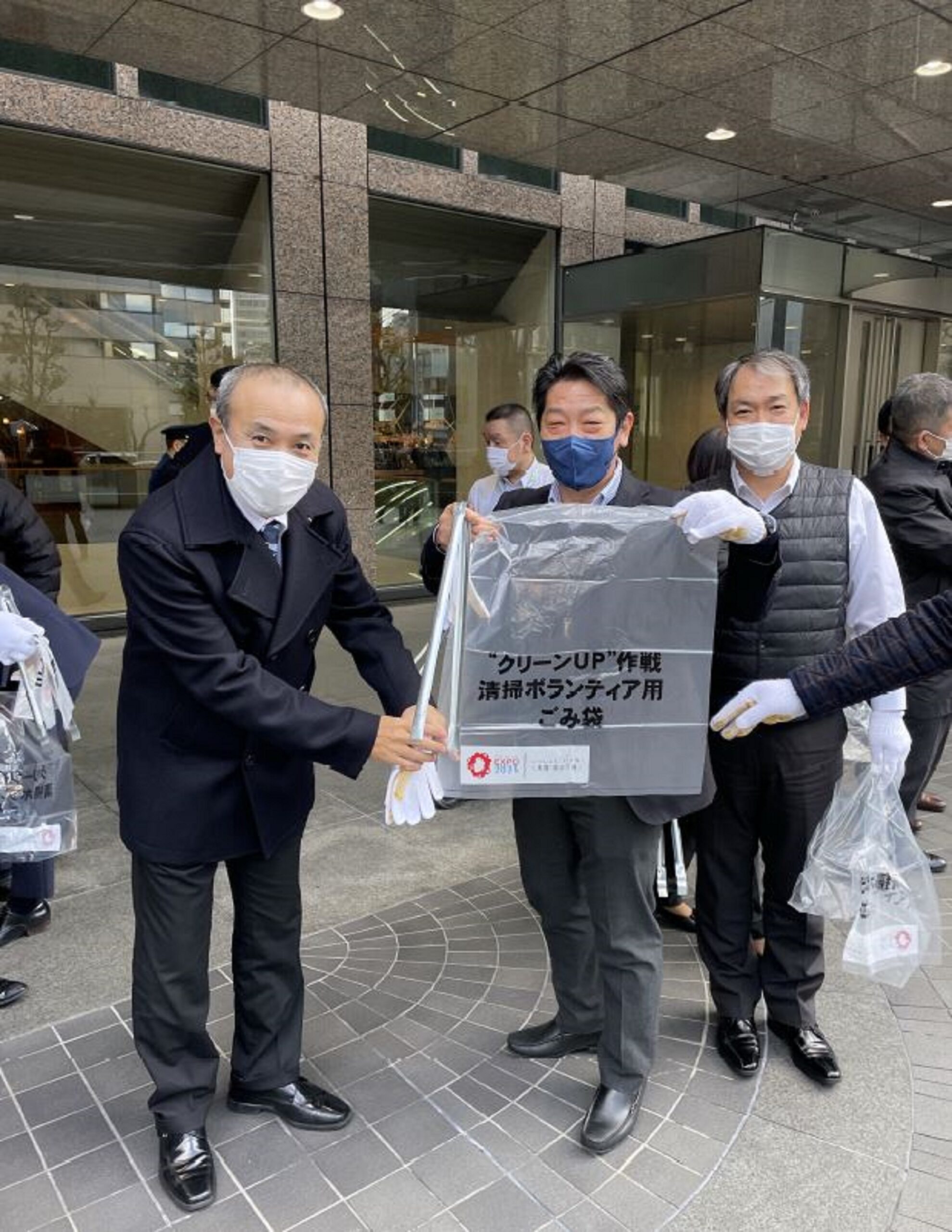 清掃活動当日は、北島大阪支社長をはじめ、JFE商事グループから50人以上が集まり、小雪が舞う寒空の下、入居する堂島アバンザのビル周辺の空き缶や紙くずなどのごみを拾い集めました。