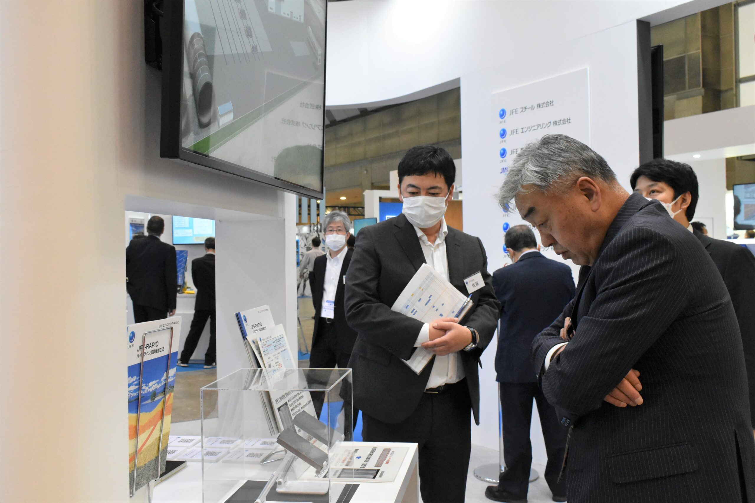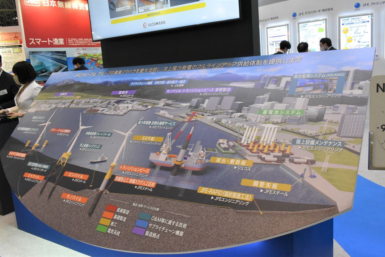 風力発電展は「スマートエネルギーWeek」として同時開催される新エネルギー分野7つの展示会の一つであり、風車の製造、風力発電所の建設、保守・運用、洋上風力技術まであらゆる製品・技術が出展される同分野における日本最大級の専門技術展です。JFEグループは、基礎構造部材向け大単重厚板などの素材供給からO&Mまで幅広いニーズに対応できるグループの総合力をPR。ブース入口前では、グループ全体の取り組みを1面パネルで紹介し、事業を可視化する展示も行いました。