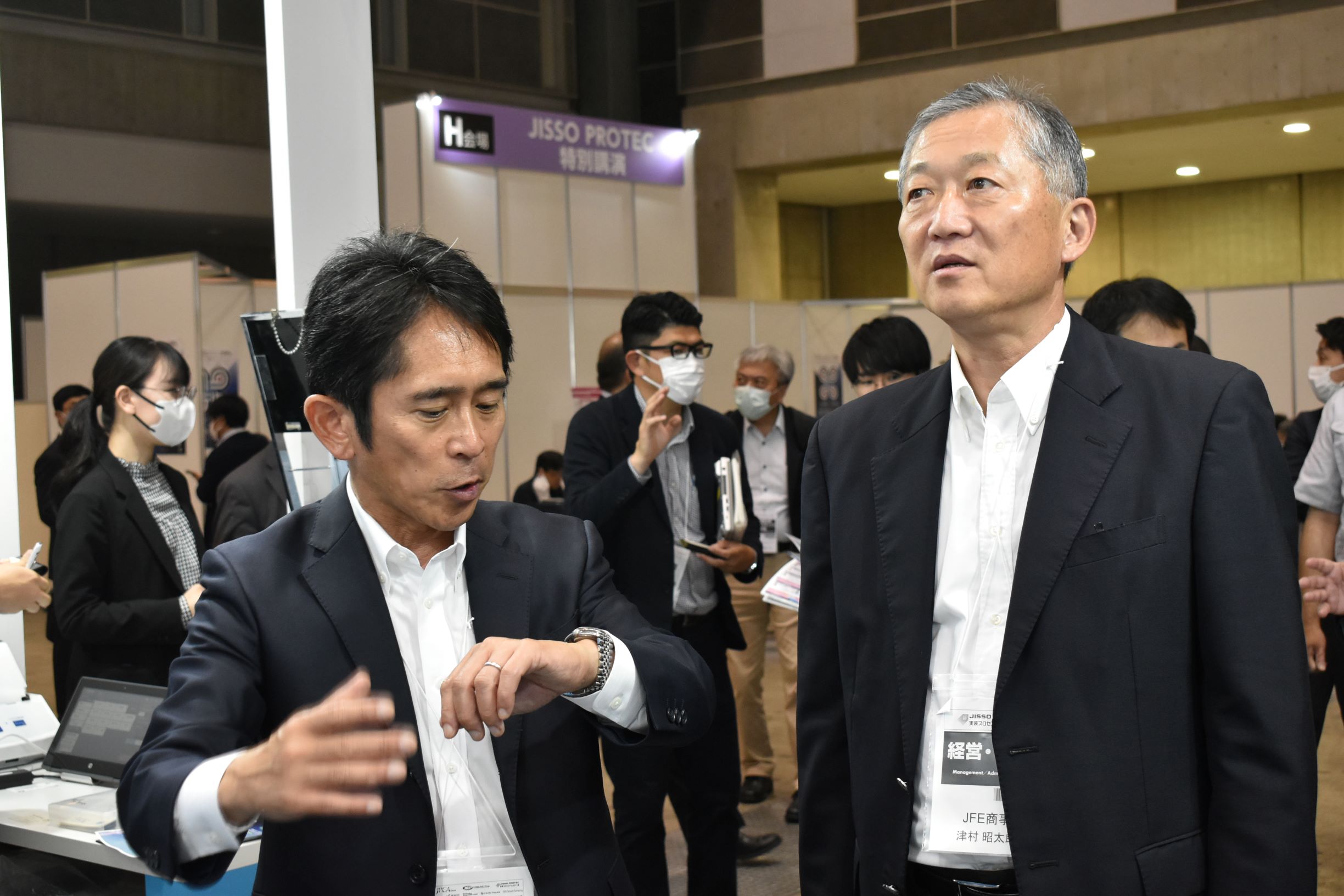 5月31日から3日間、東京ビッグサイトにて開催された「電子機器トータルソリューション展2023(JISSO PROTEC)」に当社グループ会社のJFE商 事エレクトロニクスが出展しました。同展示会は電子部品実装技術の総合展示会であり、エレクトロニクス社会に欠かせない電子部品実装に関わる最先端のテクノロジーが展示されます。今回の出展は、取扱い商材の認知向上と拡販を目的としており、会期中は予想をはるかに上回る479人が来場しました。絶え間なくブースに業界関係者が訪れ、営業担当者だけではなく技術者も総出で対応にあたるほど大盛況でした。