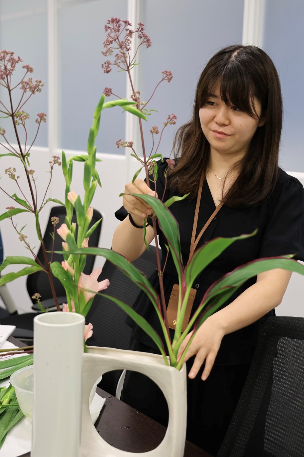 7月26日、華道部がJFE商事/本社で『小さな華道展』を開催し、JFE商事グループ社員9名が参加しました。“華道の魅力を多くの社員に発信したい”という想いから去年に続き今回で2回目の開催となりました。