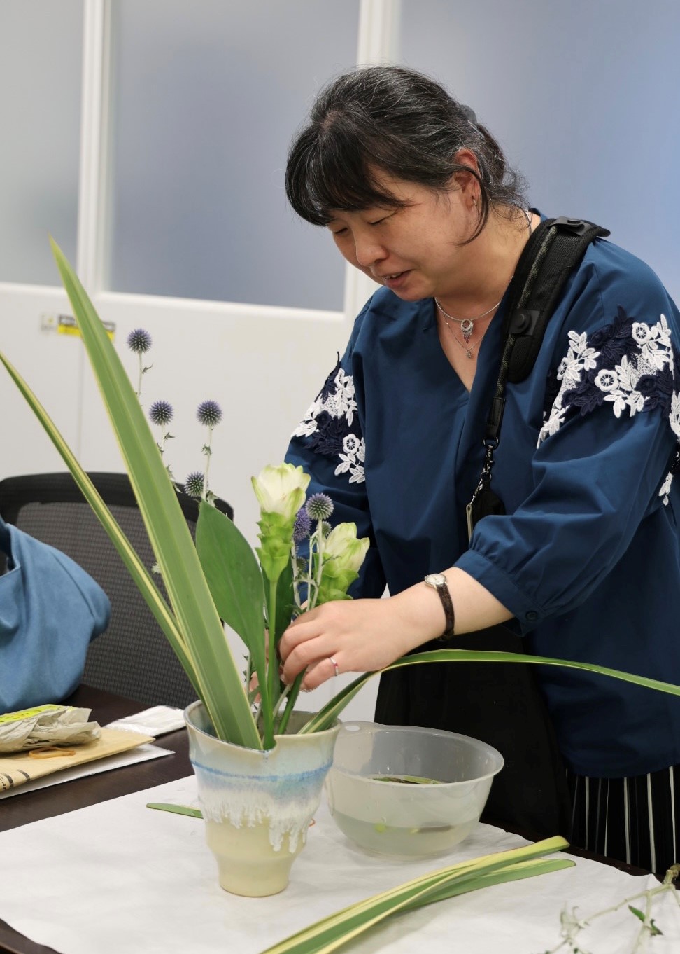 当日は華道部講師 草月流/宮本治子先生のご指導の下、各々が自由に花材や花器を選んで花を活けました。普段業務では接点のない方とも会話が弾み、終始和やかな雰囲気で活動は行われました。参加者からは「先生のアドバイスのおかげで、何とか初心者なりに良いものができあがってよかった」、「花材と花器の組合せに個性が出ていて華道の面白さを改めて感じた」等の声が寄せられました。