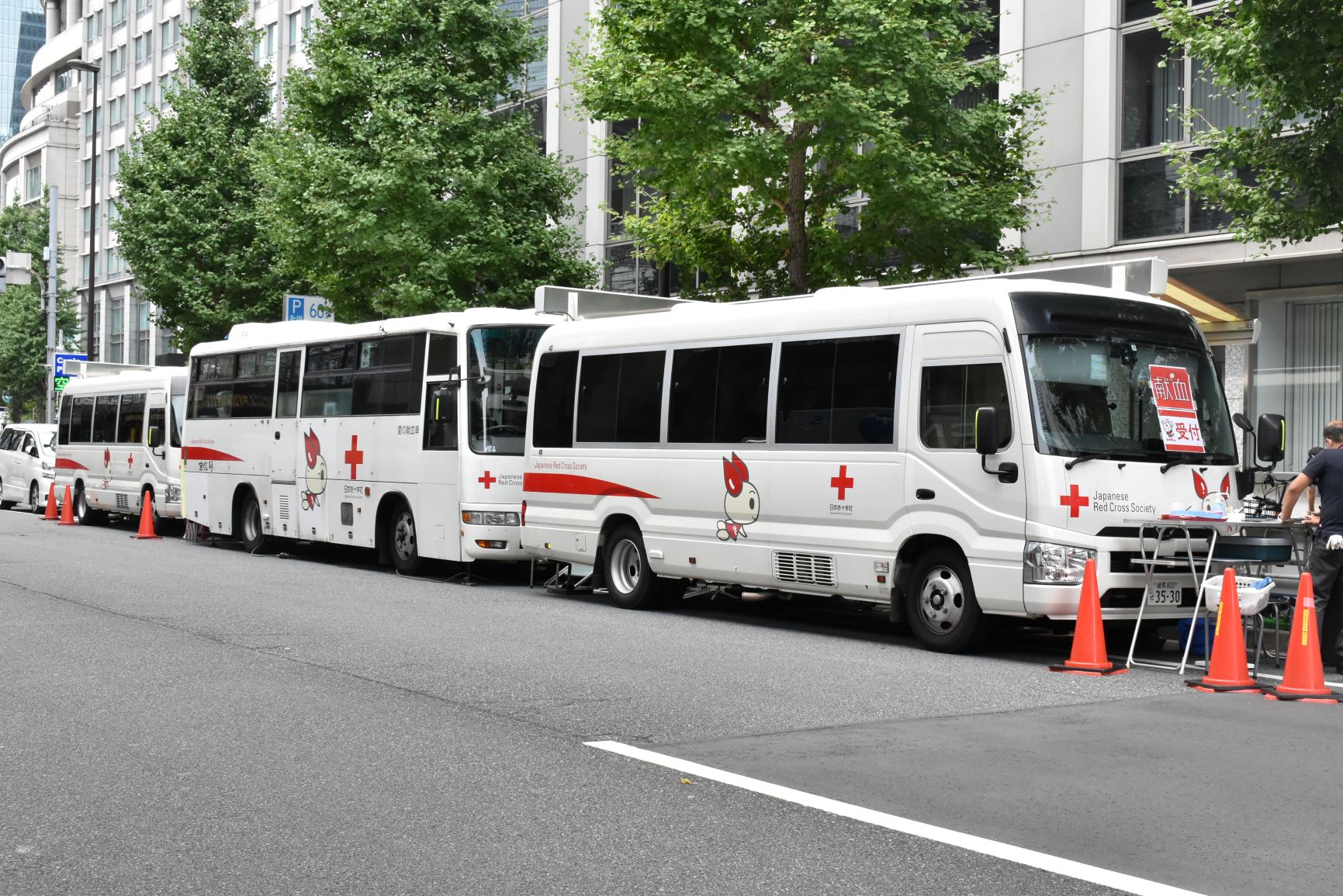 1台目のバス:受付、2台目のバス:献血、3台目のバス:献血後の休憩