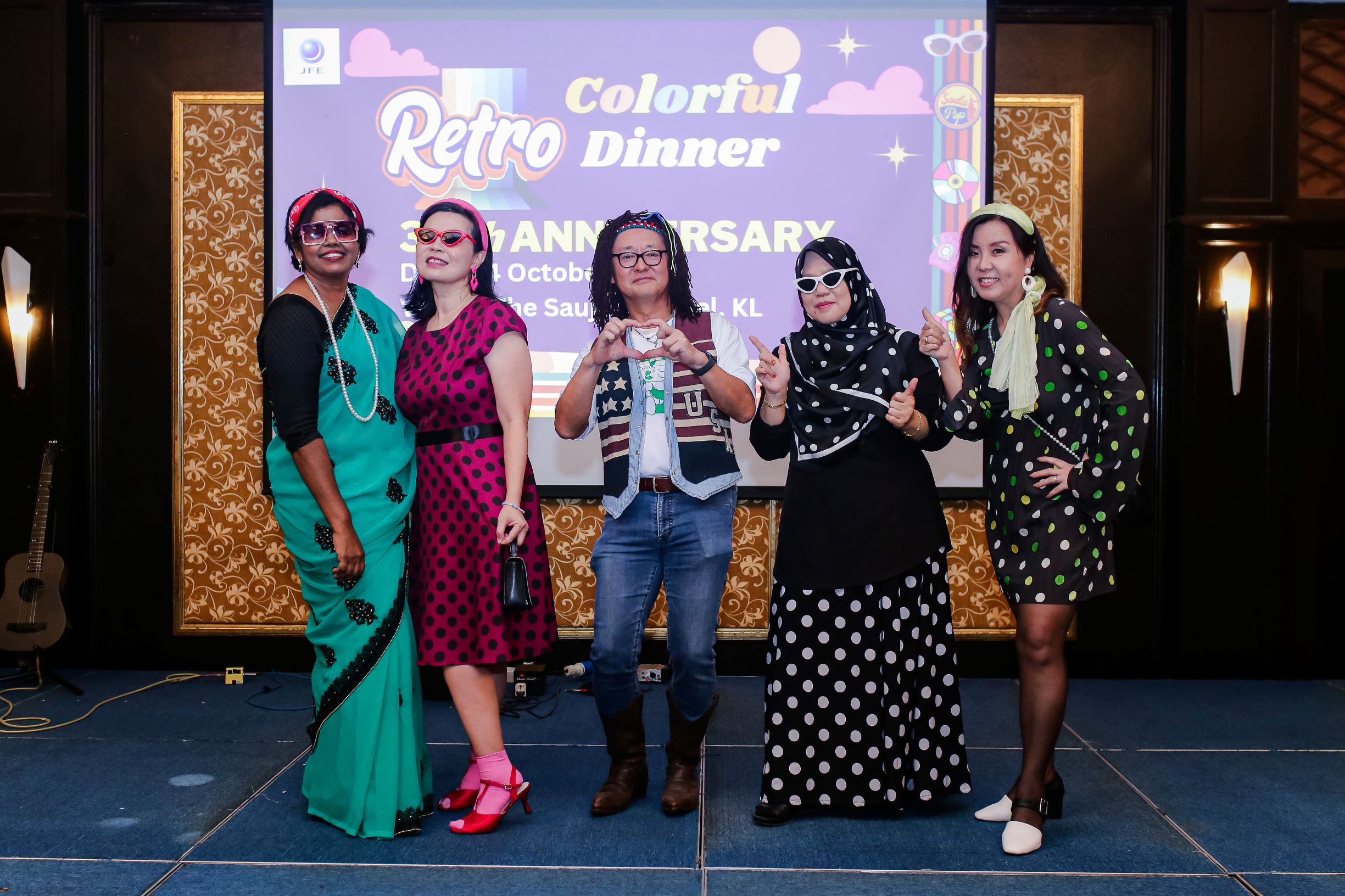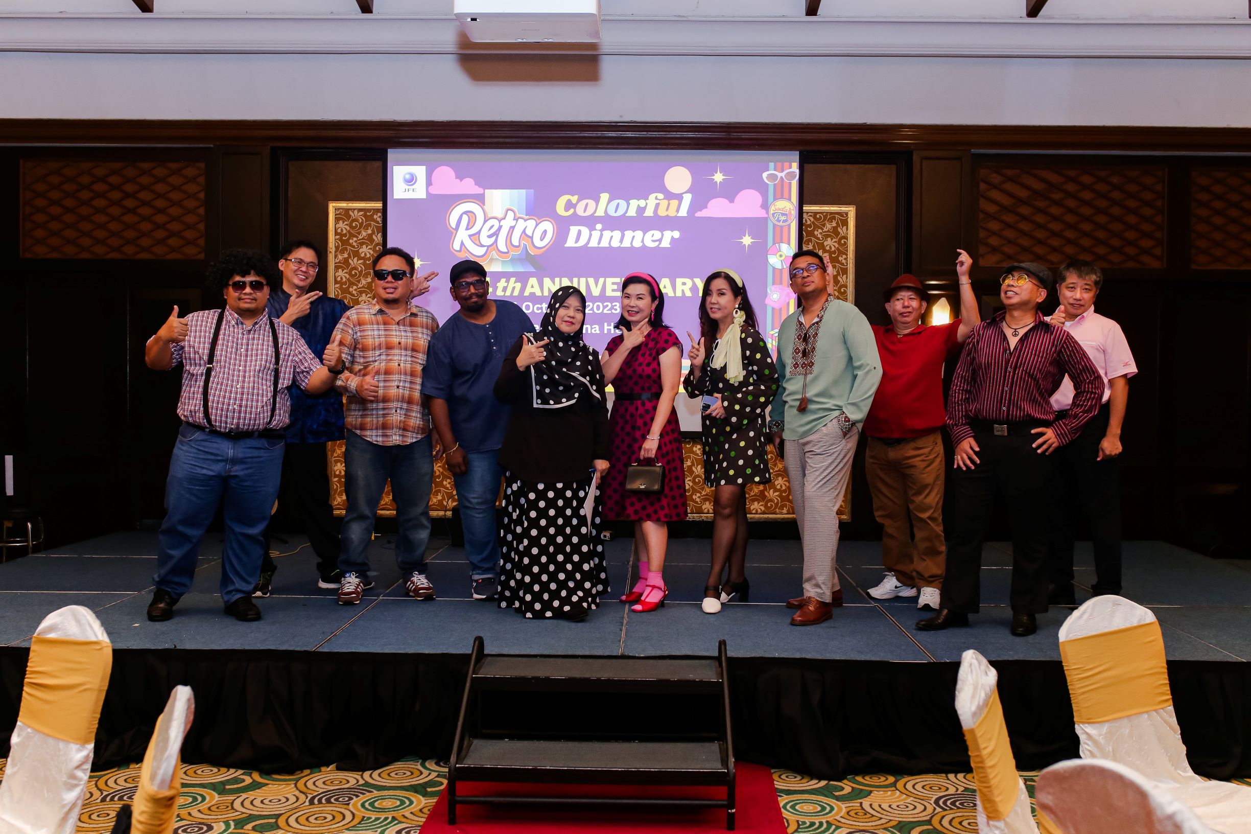 10月14日、当社グループ会社のJFE Shoji Steel Malaysia Sdn. Bhd.は「Colorful Retro Dinner」と題し、サウジャナホテル クアラルンプールにてディナーパーティーを開催しました。このパーティーは、従業員同士のコミュニケーションの活性化および、働き甲斐のある職場の構築、団結力の強化を目的に企画・運営がされています。