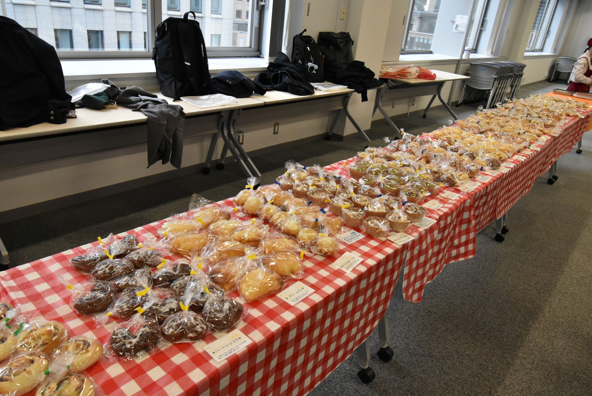 販売当日は、生徒たちがパンの搬入から陳列、トレーの消毒やレジ打ちなど販売に関わる一連の作業の全てを担当します。パンを購入した社員にはアンケートを実施し「食べみたいパン」のリクエストを受け付けており、実際に販売会では、回数を重ねるたびに新たな種類のパンが追加されていきました。従来は甘いパンの種類が多かったことから総菜パンの追加リクエストが多く寄せられたため、今年度はちくわパンやカレーツナコーンなどが新たにメニューに加わり、更に豊富なラインナップとなりました。