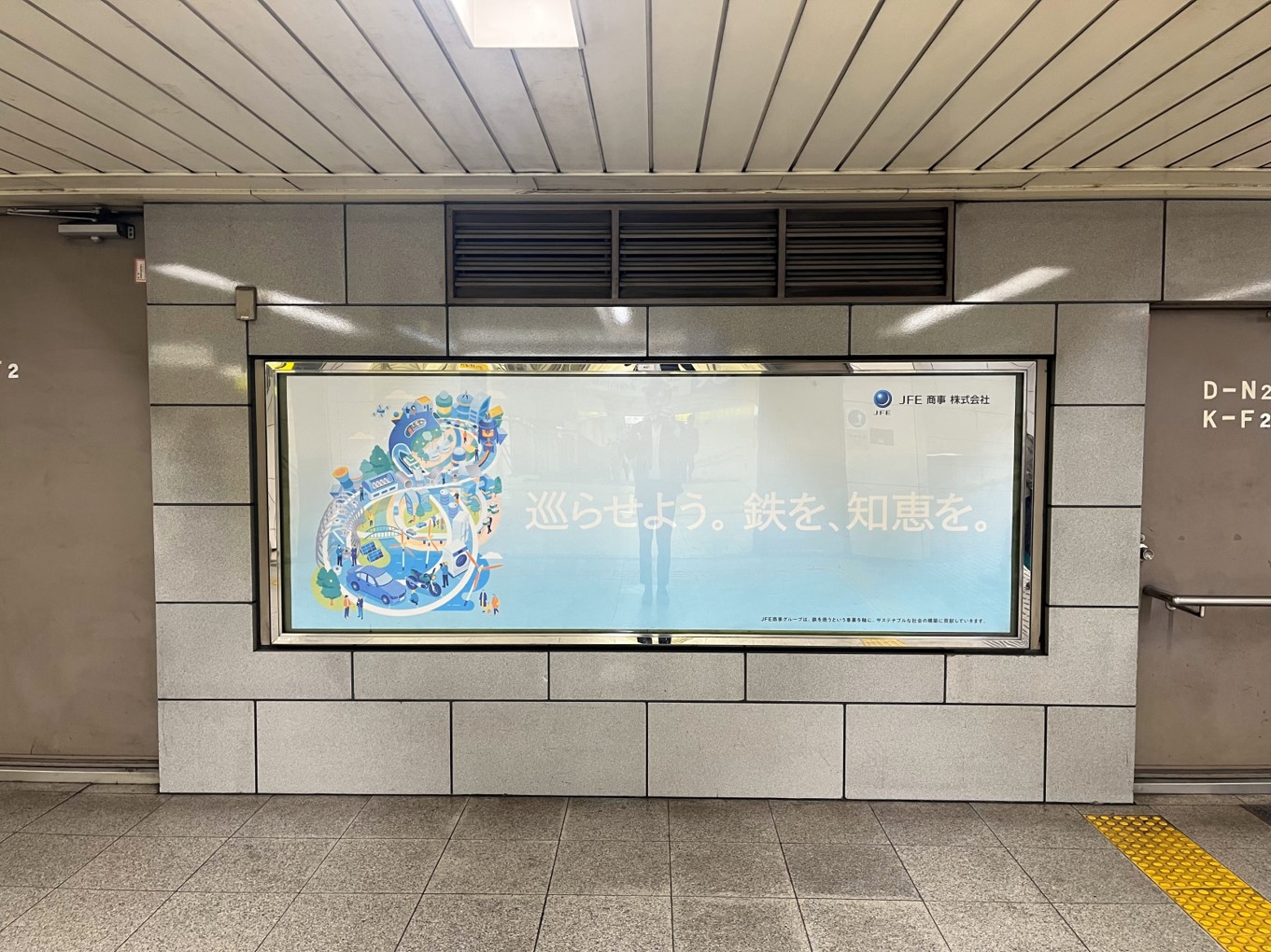当社は、サステナビリティをテーマとした新広告「巡らせよう。鉄を、知恵を。」を制作しました。 1 月11 日(木)の産業新聞への全面広告の掲載を皮切りに、駅のホームなど各所にて展開を開始しています。4月上旬からは、大阪の西梅田駅(大阪駅前第一ビル)の地下街でも掲出が始まりました。